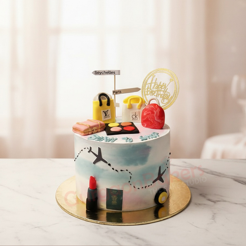Our travel-themed farewell cake featured here brings to life the adventure of new beginnings. It showcases iconic travel elements, from stylish bags to airplane graphics, symbolizing the exciting journeys ahead. This isn’t just a cake; it’s a centerpiece to ignite conversations and fond memories.